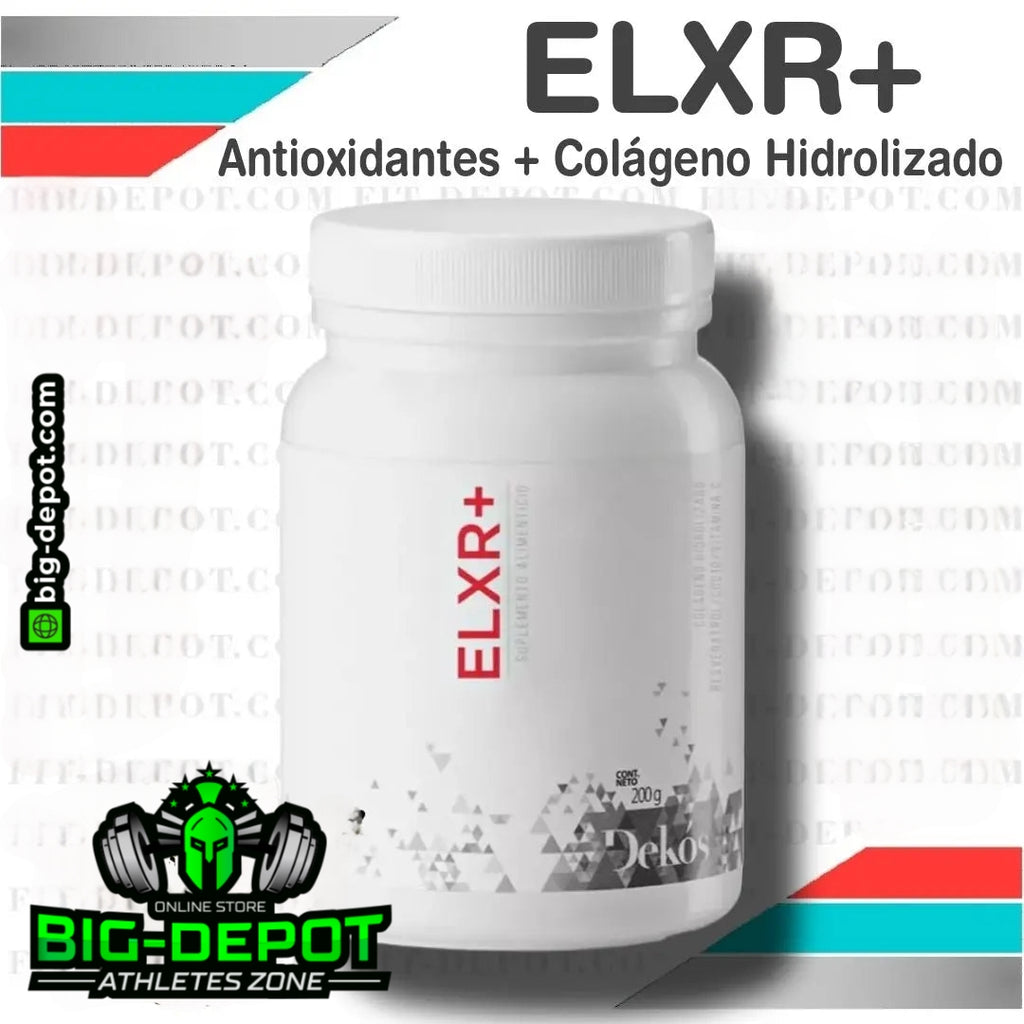 ELXR+ es un suplemento en polvo fabricado por Dekos Nutricosmetica y disponible en Big Depot México, formulado para apoyar la salud de la piel, cabello, uñas y articulaciones mediante una combinación avanzada de colágeno hidrolizado y antioxidantes.